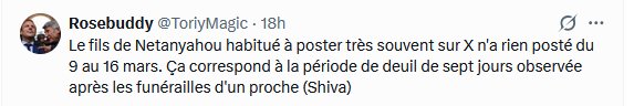 Autre remarque : le compte X du fiston de Bibi, Yair Netanyahu « from the river to the sea, this flag (celui du sionistan) is all you’ll see! », « du fleuve à la mer, ce drapeau est tout ce que vous pouvez voir », semble être à nouveau actif, sauf que ce ne sont plus que des messages d’autres personnes repostés.