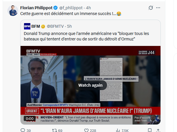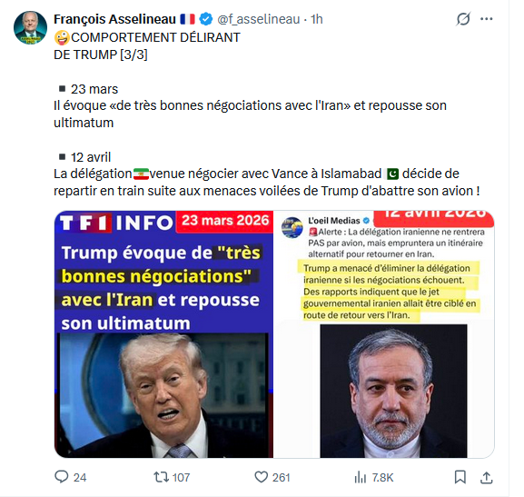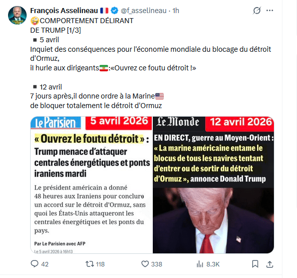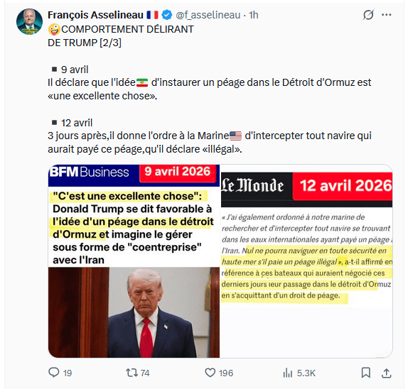 Donald Duck Trump sur TruthSocial : « Tous les navires, avions et militaires américains, ainsi que les munitions, armes et tout autre matériel nécessaire à la poursuite et à la destruction létales d’un ennemi déjà considérablement affaibli, resteront en Iran et dans ses environs jusqu’à ce que le véritable accord conclu soit pleinement respecté.