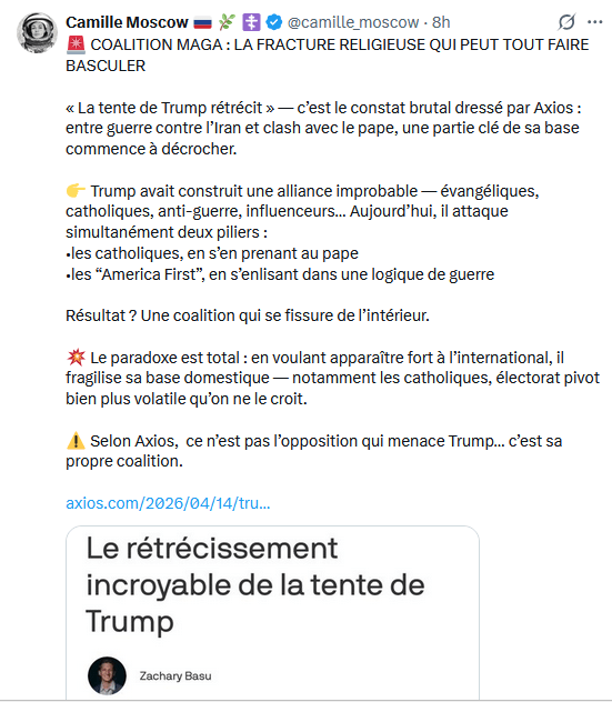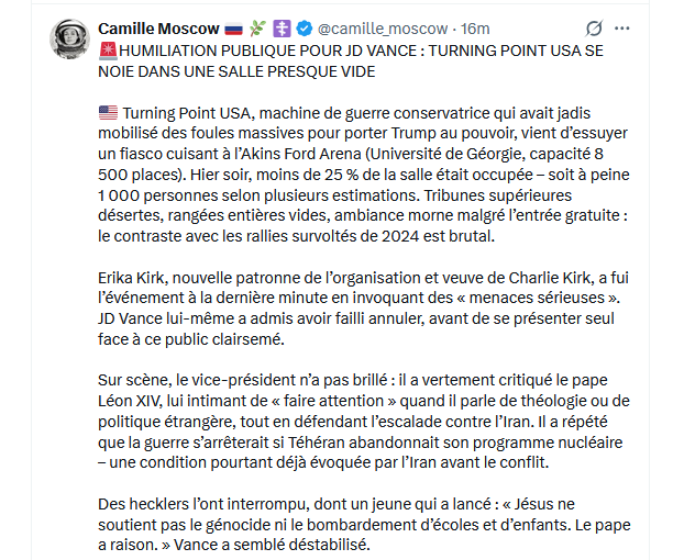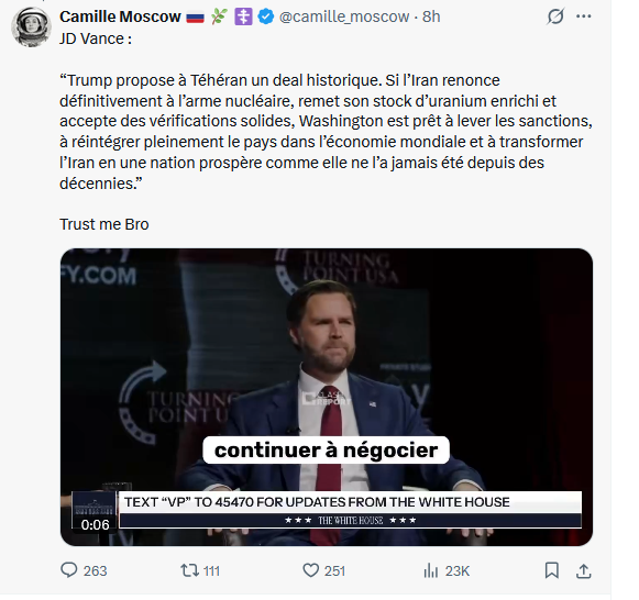 L’Iran a le soutien actif de la Russie et de la Chine, tant au niveau diplomatique que militaire, et Donald aurait intérêt à rabaisser son caquet de pitre irresponsable à la fois pitoyable et délétère. La fin de l’empire siono-étatsunien génocidaire est bien en marche. Mais malheureusement pour la France, la dictature de l’U.E. n’a pas encore été abattue. Et il y en aura encore des soubresauts mortifères à venir.
