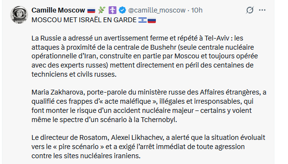 La déclaration est même présentée comme « le message du porte-parole chinois à Israël ». L’Iran et la Chine sont très proches dans le cadre de leur partenariat stratégique. Ce message vise clairement à dissuader Israël d’utiliser l’arme nucléaire (jamais déclarée officiellement par les sionards) contre l’Iran.