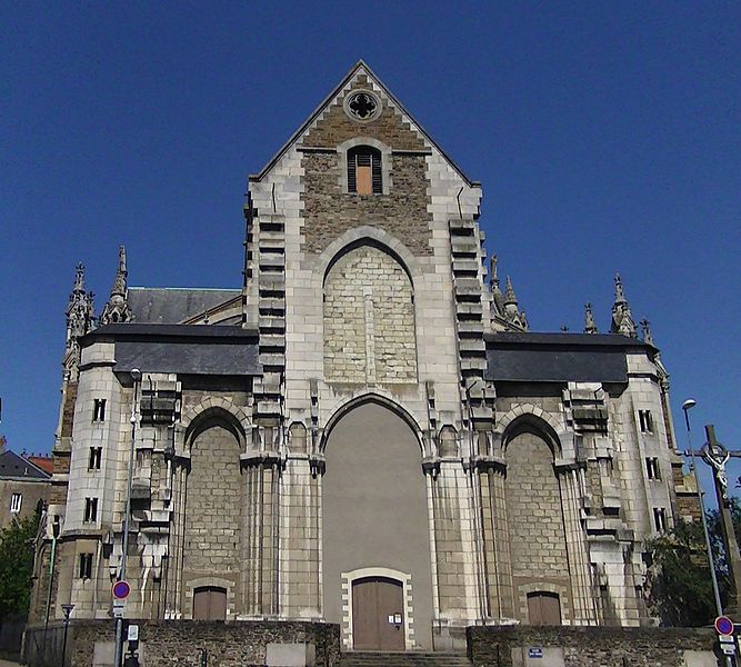 Cette histoire de travée me fait penser à cette église nantaise qui a perdu, comme un saucisson des rondelles, son porche et une travée ou plusieurs pour laisser place un jour à la rue ; et dont le nouveau porche, si on peut dénommer ça un porche, consiste en de simples murs de comblement en tuffeau et autres pierres, assez hideux, qu’on en juge (quel goût ! on voit encore le départ des arches des travées supprimées en avancée de la « façade ») :