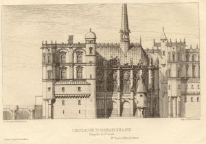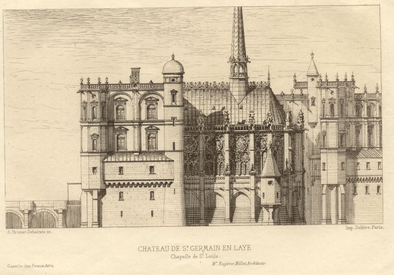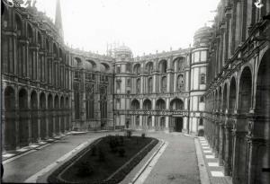 Deuxième exemple, il s’agit d’un monument plus connu (ici sa cour intérieure après restauration) : le château de Saint-Germain-en-Laye longtemps résidence des rois de France, dont la restauration fut décidée en 1862 par Napoléon III pour en faire un musée et qui s’acheva au début du XXe siècle, sous les directions de Millet (de 1862 à 1878), de Laffolye (de 1879 à 1889) et enfin de Daumet (de 1889 à 1908).