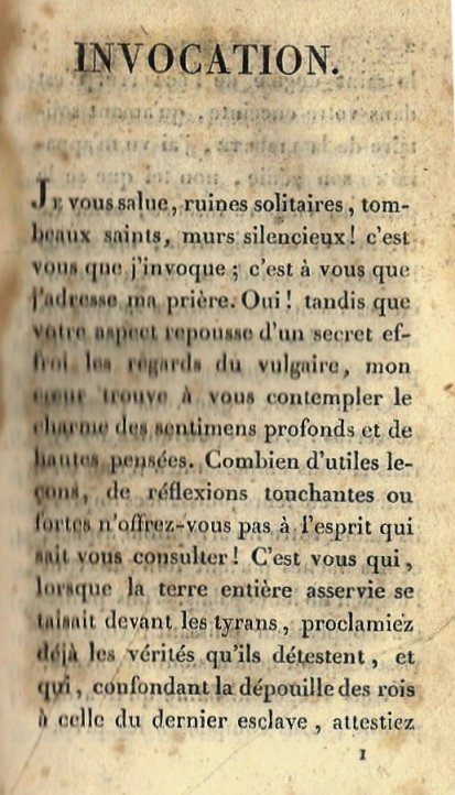 Je vous salue, ruines solitaires, tombeaux saints, murs silencieux! c’est vous que j’invoque; c’est à vous que j’adresse ma prière. Oui! tandis que votre aspect repousse d’un secret effroi les regards du vulgaire, mon cœur trouve à vous contempler le charme des sentiments profonds et des hautes pensées. Combien d’utiles leçons, de réflexions touchantes ou fortes n’offrez-vous pas à l’esprit qui sait vous consulter! C’est vous qui, lorsque la terre entière asservie se taisait devant les tyrans, proclamiez déjà les vérités qu’ils détestent, et qui, confondant la dépouille des rois avec celle du dernier esclave, attestiez le saint dogme de l’égalité. C’est dans votre enceinte, qu’amant solitaire de la liberté, j’ai vu m’apparaître son génie, non tel que se le peint un vulgaire insensé, armé de torches et de poignards, mais sous l’aspect auguste de la justice, tenant en ses mains les balances sacrées où se pèsent les actions des mortels aux portes de l’éternité.