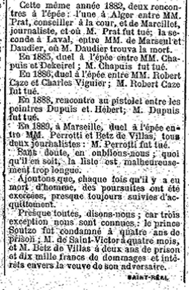 Un article du Gaulois du samedi 25 juin 1892 intitulé Les suites d’un duel tragique (il s’agissait de l’évocation de la mort d’un jeune officier d’active, Armand Mayer, tué dans un duel à l’épée par le dit marquis de Morès, duel qui fit couler de la salive politicienne et de l’encre tant et plus dans toutes les gazettes du temps) répertorie les duels tragiques des années écoulées :