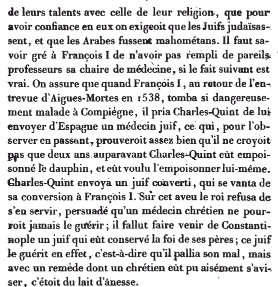 Mais François Ier qui avait un rapport curieux avec les juifs, justement. Lisons en guise de fable, ou mieux de parabole de clôture (parabole de fin, pas d’enfermement monastique), ce passage (tome quatrième, pages 212-13) du livre de Gabriel Gaillard intitulé Histoire de François Ier, roi de France (Blaise, libraire, Paris, édition de 1819 ; première édition en 1766-69) :