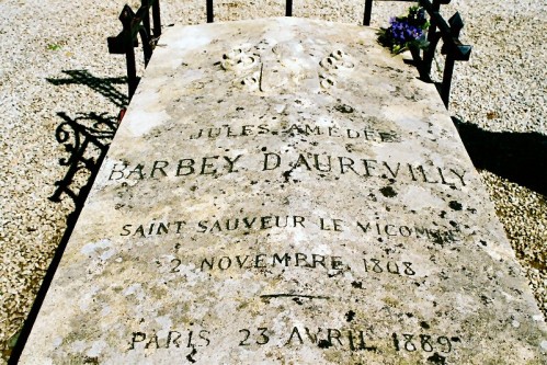 Voici, à l’heure présente, la tombe de Barbey, sise à Saint-Sauveur-le Vicomte. Une pierre tombale dans le style ancien avec en ajout presque dépareillé, une croix pattée affinée, toute de fer forgé. Croix munie à sa base de deux volutes, disons de deux cœurs. Ensemble qui, je ne sais pourquoi, me fait penser à une baguette en coudrier de sourcier ou… à un ensemble un peu plus trivial… à prépuce.