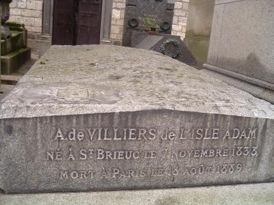 Et maintenant la dalle encore plus succincte, virant janséniste, recouvrant les restes de Jean, Marie, Mathias, Philippe, Auguste de Villiers de L’Isle-Adam, au Père Lachaise. J’ignore de quand date ce monument ; et les autres sépultures ici présentes, d’ailleurs. Tombe d’un autre chrétien, fort peu orthodoxe. S’il y a une croix, elle est bien cachée. De croix, que dalle ! Mais d’après Bloy, spécialiste ès catholicisme, Villiers ne fut-il pas d’ailleurs « le chrétien qu’il eût pu être et qu’il croyait être… » Et puis, il n’était plus là pour donner son avis…