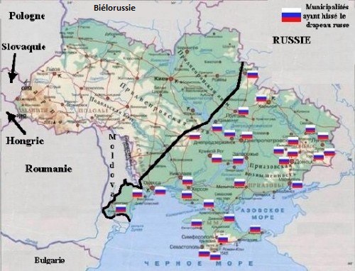 Elle est celle des municipalités qui viennent récemment de hisser le drapeau russe. Le clivage est patent. En gros, région de l’intérieur à l’Ouest et au Nord, pro-occidentale avec complètement à l’Ouest la Galicie paysanne, le foyer de l’ultranationalisme ukrainien et à l’Est, Kiev la capitale. Région liée à la Mer Noire : Est et Sud, pro-russe avec complètement à l’Est le Donbass ouvrier et au plein Sud, le port d’Odessa et la Crimée avec Sébastopol, base navale russe.