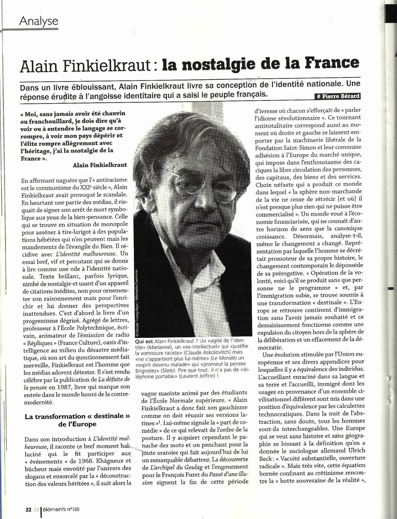 3 – Voici enfin du dernier numéro en date d’Éléments, la revue dite de la « nouvelle droite » donc pour le dire autrement « nouvellement hémiplégique »*, le début d’un article, gluant de soumission sans le dire au sionisme, sous couvert de défense de « la France de souche ». Finequellecrotte découpé (il n’y a que là qu’il est coupé) en bonnes tranches « élémentaires » étant l’Élu, le juif de service pour expliquer aux franchouillards ce qui est bon ou mal pour eux-mêmes et pour la France. Type même du petit blanc ashkénaze judéo-sioniste antimusulman et talmudique pour ne pas dire mosaïque. Cité en référence par le tueur norvégien Breivik, c’est dire sa valeur.