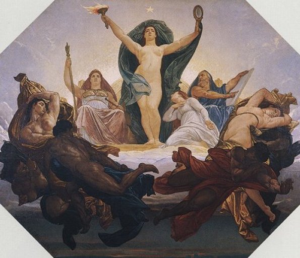 autre peintre académique oublié ; d’origine bretonne et républicain radical, il vanta principalement les vertus « nouvelles » dans ses tableaux, fresques ou plafonds de grande envergure… comme cette allégorie de La Vérité, image pieuse et pompière laïque :