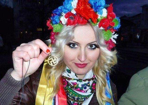 Tête à claques ukrainienne nous montrant son swastika lors d’une manifestation des années passées « pour la démocratie » (sic). Du néo-nazisme à la sauce ukrainienne de l’ouest ukrainien ou de Kiev. Je précise que personne n’est propriétaire de ce symbole, ni d’aucun symbole d’ailleurs et que le svastika est un symbole multiséculaire, qu’il remonte au moins au néolithique et qu’il est ou a été de pratiquement toutes les civilisations, ou qu’il a été et est encore de l’art chrétien sur les sols de certaines églises ou cathédrales, en compagnie du labyrinthe, etc. Depuis des millénaires il règle en particulier la vie des asiatiques. Dextrogyre, il symbolise par exemple, l’Éternité pour les chinois. Sinistrogyre, il symbolise par exemple, la Nuit et Kali, la déesse de la Destruction, chez les hindouistes. En fait le dextre et le senestre vont de concert en ces contrées, comme le yang avec le yin. La connasse ne sait donc pas ce qu’elle tient en main. Les « antiracistes » professionnels et patentés que l’on sait, si prompts à voir un salut fasciste inversé dans la quenelle anti-système dieudonnienne, n’ont pas encore émis, à ce que j’en sais, la moindre réserve sur cette « croix gammée nazie inversée ». Swastika/svastika veut dire : « ce qui est bien », en traduction littérale : bien (su) est (asti) ce/cette chose (-ka). Et là, avec les bandits bandéristes, je crois que l’on est bien loin du compte ! Idéologie à la fois sinistre et de pacotille.
