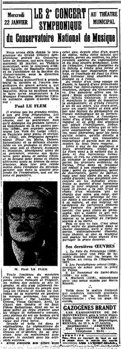 Ouvert à tous, et très éclectique, tel fut le fond de la pensée musicale de Paul Le Flem qui sur le tard se risqua même dans la musique atonale. On a l’impression à l’écouter qu’il aurait inversé la logique des choses humaines, pour le dire en peu de mots : grande nostalgie de jeunesse, grande verve de vieillesse, et entre les deux ouvertures variées d’âge mûr.