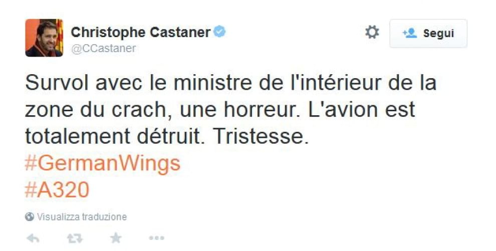Je connaissais les mots « krach » (boursier), le « crack » (stupéfiant), et le « crash » (d’avion). Moi, ayant été élevé dans l’amour de la langue française, et n’ayant aucun besoin de baragouiner frangliche, je ne dis donc pas qu’il y a eu un « crash » d’un Airbus. Je dis qu’il y a eu un accident d’Airbus. Mais alors là, il y a un monsieur Castaner qui a fait très fort. Voyez son « tweet » et sa bonne bouille barbue et souriante. Le monsieur (qui est député des Alpes de Haute Provence) ne cesse de «tweeter». Survolant le lieu de l’accident, il déclare qu’il n’y a « rien d’autre que des débris et des corps », ce qui est d’ailleurs malheureux mais logique : dans tous les accidents d’avion, il y a des débris d’avion et des corps. On n’a jamais vu, je crois, et à condition que l’appareil ait été retrouvé, un accident d’avion sans débris. Mais Monsieur Castaner vient aussi d’inventer un mot nouveau, le « crach » d’avion. Bravo pour le français, sous la plume d’un député de la République française. Et ce sont les habitants du village français de Crach qui vont être (mé)contents…