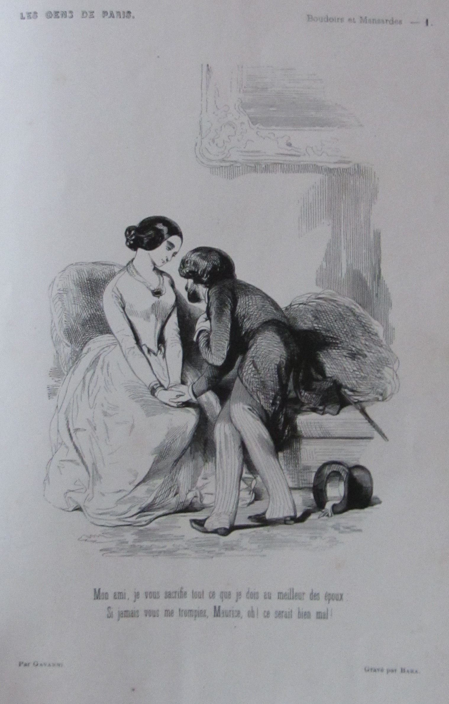 Série : Boudoirs et Mansardes — Mon ami, je vous sacrifie tout ce que je dois au meilleur des époux. Si jamais vous me trompiez, Maurice, oh! ce serait bien mal ! Gavarni / Bara