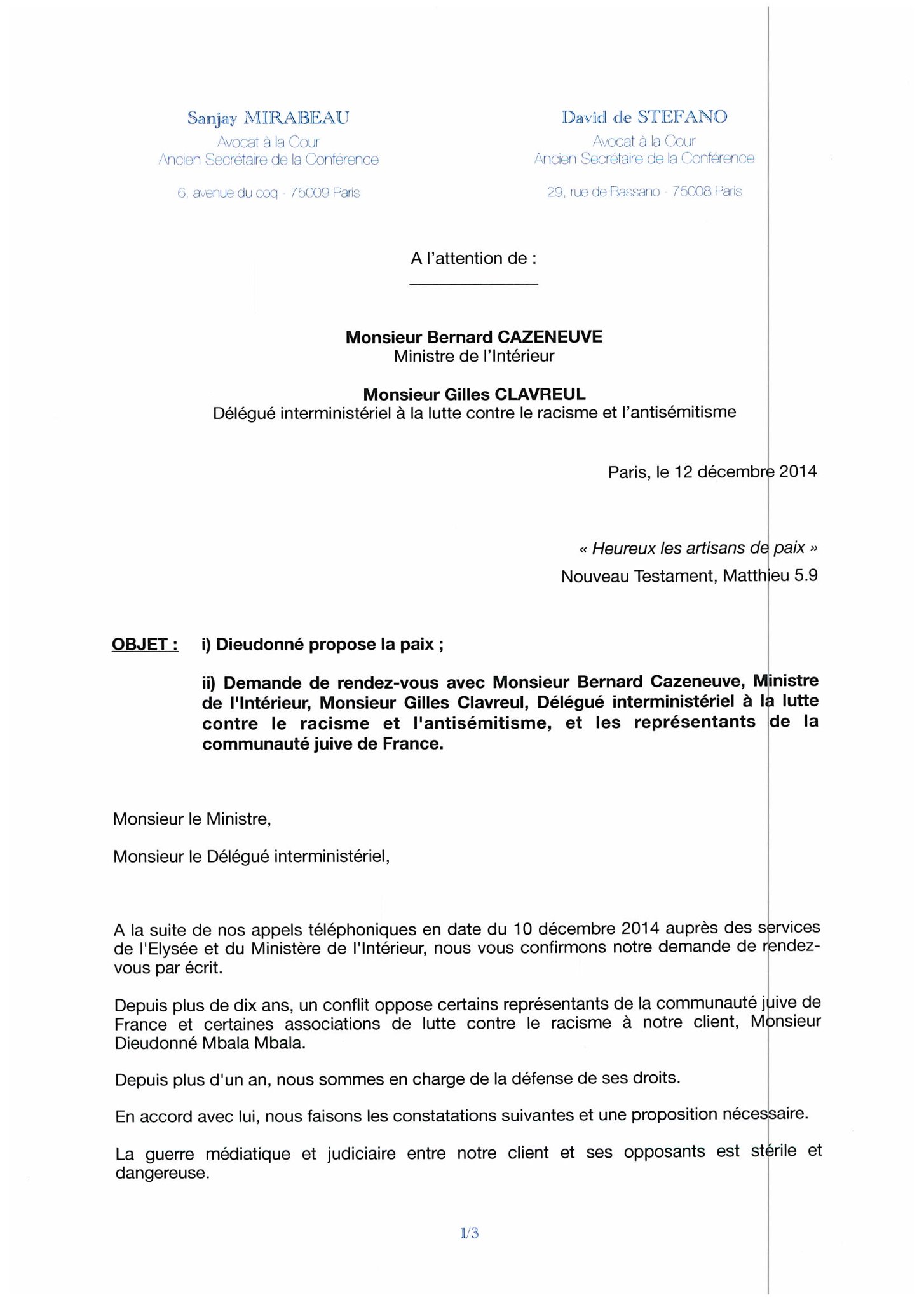 Il y en aurait à dire sur cette lettre pathétique de reniement et commenter (mais je n’en ai ni le temps ni le goût) ; ce qui me fait le plus rire (jaune) c’est le passage sur « la qualité d’artiste » ; personnellement je n’ai jamais réclamé ma qualité de quoi que ce soit, et de ce que je suis, pour de vrai ou pour de rire, à qui que ce soit. Et bien sûr : « Dieudonné propose la paix » !!! Surréaliste.
