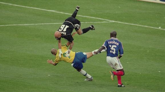Fabien Barthez boxe [sic] un ballon au-dessus de l’attaquant brésilien Ronaldo, le 12 juillet 1998 en finale de la Coupe du monde, au Stade de France à Saint-Denis (Seine-Saint-Denis). (BOB MARTIN / SPORTS ILLUSTRATED / GETTY IMAGES)