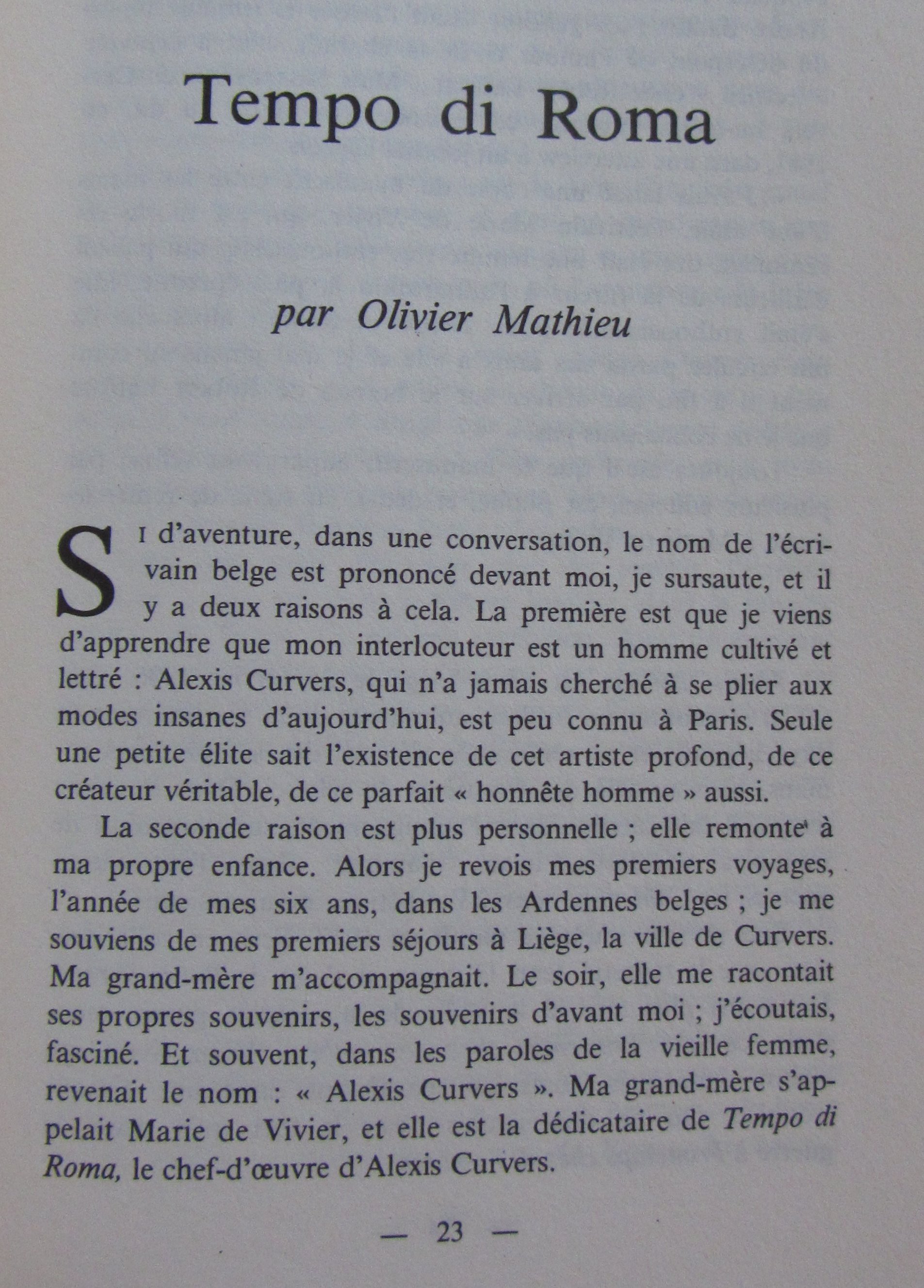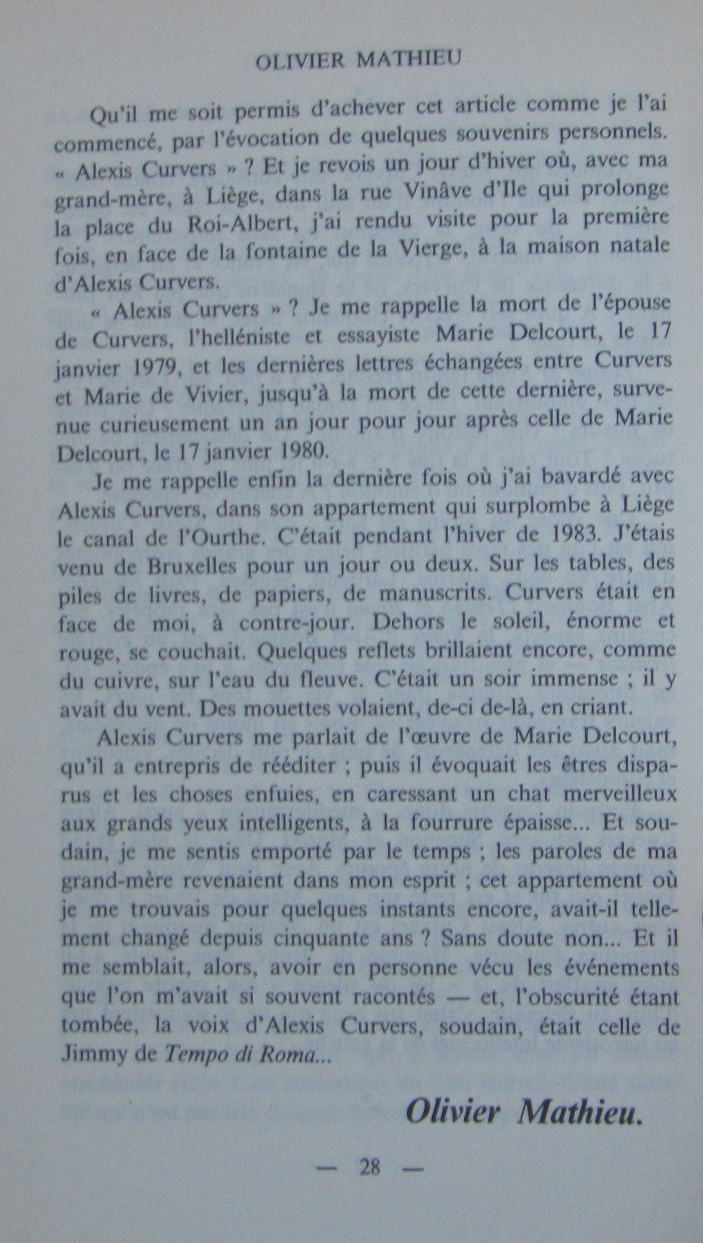 A noter que la revue liégeoise « Ouvertures » (directeur: M. Jean-Claude Bologne) avait publié, vers 1981, un « numéro spécial Alexis Curvers », qui avait été rendu possible parce qu’Olivier Mathieu avait présenté Alexis Curvers à M. Bologne.