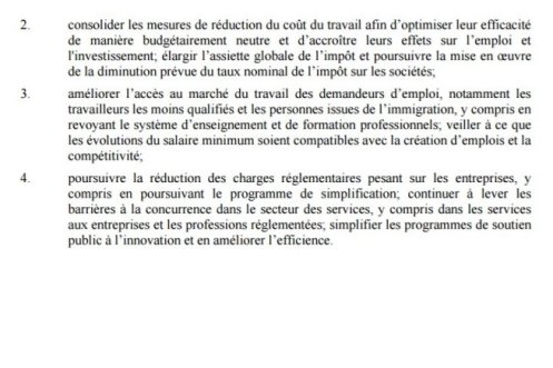 Le document précise que, « en tant qu’État membre dont la monnaie est l’euro, et compte tenu des liens étroits entre les économies de l’Union économique et monétaire, la France devrait veiller à mettre en œuvre intégralement et en temps utile la recommandation concernant la zone euro, qui est prise en compte dans les recommandations figurant aux points 1 à 4 ci-dessous ».