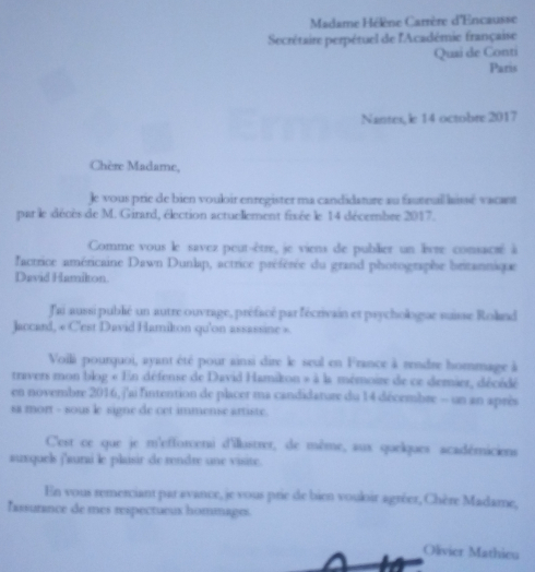 Lettre de candidature à l’Académie, pour l’élection du 14 décembre 2017