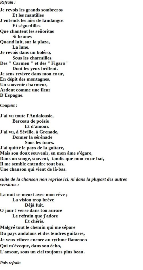 3 – Accordéoniste devenu célèbre dès le milieu des années 20 dans les bals musette parisiens qu’il animait avec son ensemble, Jean Vaissade (né en 1911 à Cougoussac en Lozère, mort en 1979 à Vincennes) commença à enregistrer des disques à saphir dès l’âge de quinze ans, avec, à cette époque, un inconnu au banjo, un certain Django Reinhardt. Vaissade est l’auteur d’un grand nombre de mélodies de chansons de l’entre-deux-guerres qui furent d’énormes succès populaires, dont les vingt-deux titres enregistrés par Rina Ketty qu’il avait épousée en 1938 (mais ils divorceront dès 1940) ; et en particulier ce paso-doble à trois temps (en 12/8) “Sombreros et mantilles”. Il faut savoir que le paso-doble (le pas double), au départ simple marche à deux temps, née en Espagne pour accompagner l’entrée des toréadors dans l’arène, a été développé et codifié, avec de nombreuses variantes, dans la France des années vingt et trente. Un grand nombre des paroles des chansons composées par Jean Veissade sont de son complice Léon Depoisier dit Chanty (18??-19??), à une époque où il était encore de bon ton de ne pas écorcher les mots chantés et de « torcher » comme il faut la rime riche, voire interne, les sentiments, et du vocabulaire. (cf. https://www.fremeaux.com/ ; fremeaux et associés éditeur).
