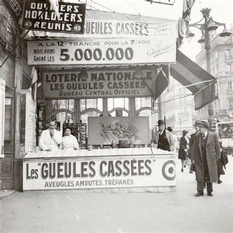 Parmi les billets de Loterie Nationale (on ignorait encore la Française des Jeux, le loto et les profusion d’autres Bingos) se trouvaient des billets Gueules Cassées, et peut-être uniquement que ça, souvenir incertain. Gueules Cassées, expression inventée dit-on par un certain colonel Picot, lui-même Gueule Cassée. Billets dont la vente, les bénéfices servaient à alimenter les caisses, mais sans doute avec moins de compassion qu’entre-les-deux-guerres déjà, de la Fondation du même nom. Personnellement, je n’en ai jamais acheté pour l’unique raison que les seules tombolas où j’ai jamais mis mon obole étaient des tombolas de kermesses scolaires. Ayant toujours trouvé les jeux d’argent gobe-gogos ou méprisables (ce qui n’est pas l’opinion du semi-mafieux Castaner).