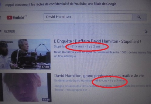 L’une des émissions de téloche ayant craché le venin des pipoles et des journaleux sur David Hamilton, le Maître, a eu 82 160 vues en trois ans. Avec 136 pouces levés et 47 baissés.