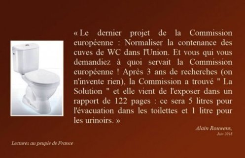 — Oh, là, je crois qu’ils ont atteint les bas-fonds de la civilisation. Il faut bien se résoudre à le dire, l’Union Européenne a, d’une manière générale, un côté fiente et zone d’épandage. Et j‘te dis pas, les problèmes en perspective, si les Turcs entrent dans ladite Europe. Quid des toilettes « à la turque » ? On sera encore dans une belle m…