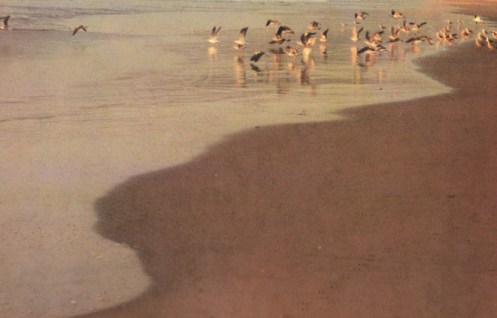 « Ils forment entre eux les plus intéressants contrastes, depuis le veau marin (…) jusqu’au flamant au long cou et aux longues jambes, qui reste debout, les pieds dans l’eau, le croupion posé sur le sommet du cône de vase où il couve ses œufs. L’un, marbré et d’une couleur tannée, ressemble à un rocher; l’autre, de couleur de feu, apparaît comme une flamme qui sort du sein des eaux« .