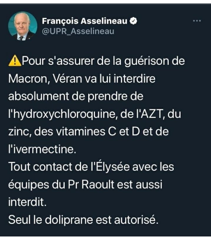 C’est Asselineau qui, à défaut de se joindre aux Patriotes dans la rue comme on aurait pu s’y attendre et le souhaiter depuis longtemps, ironise sur le traitement médical du branleur de l’Élysée :