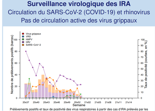 En semaine 53 : aucun prélèvement ne s’est révélé positif au SARS-CoV-2 (COVID- 19) parmi les échantillons prélevés, et 17 patients présentant une IRA vus en consultation 23,1%) étaient positifs au hRV (virus du rhume).