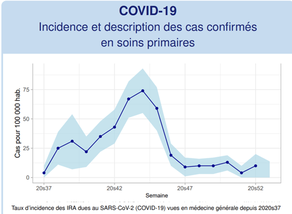 Ces données permettent d’estimer qu’en fin d’année 2020, le taux d’incidence des cas d’infections respiratoires aigües dus au SARS-CoV-2 (COVID-19) vus en médecine générale était inférieur à 14 cas pour 100 000 habitants[7], représentant moins de 9 097 nouveaux cas de COVID-19 ayant consulté un médecin généraliste.