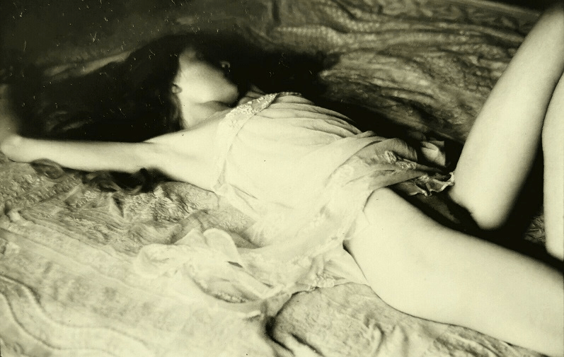 Photographie bien connue de David Hamilton, ici en noir et blanc, datant des années 1970. La modèle prend une pose que l’on retrouvera souvent dans l’oeuvre de David Hamilton.