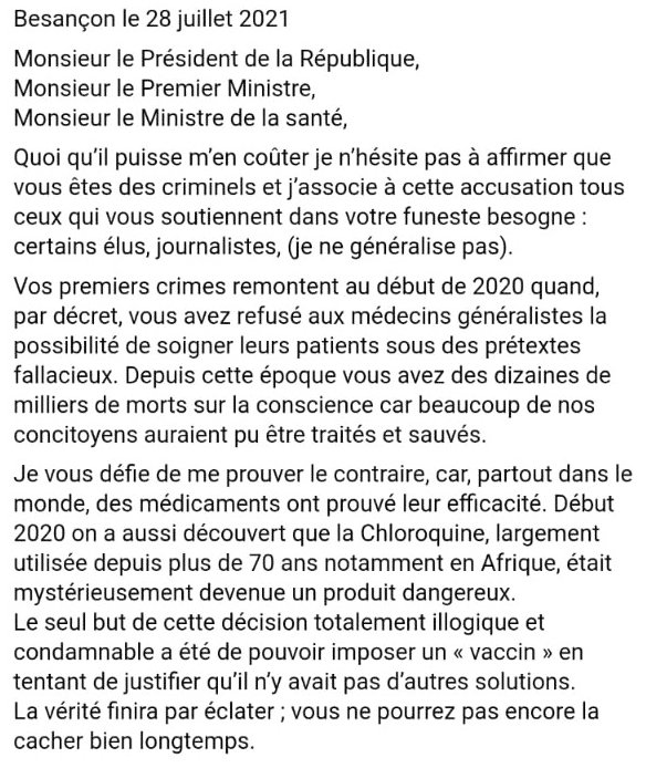 N B Je le répète encore : La chloroquine dont on sait depuis le SRAS-Cov-1 (2002-2004) qu’elle est efficace (c’est justement pour ça qu’elle a été déclarée toxique (sic) par la criminelle Buzyn) ; du moins en prenant la maladie suffisamment tôt, et non pas en disant aux gueux : « Prenez un doliprane et si vous ne pouvez plus respirer allez mourir à l’hôpital (j’exagère à peine le contenu d’une pub gouvernementale qui a tourné pendant des mois sur les chaînes de télévision en 2020). Salopards !