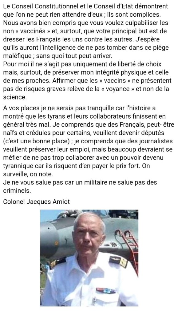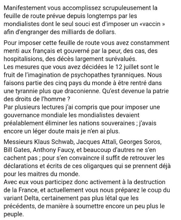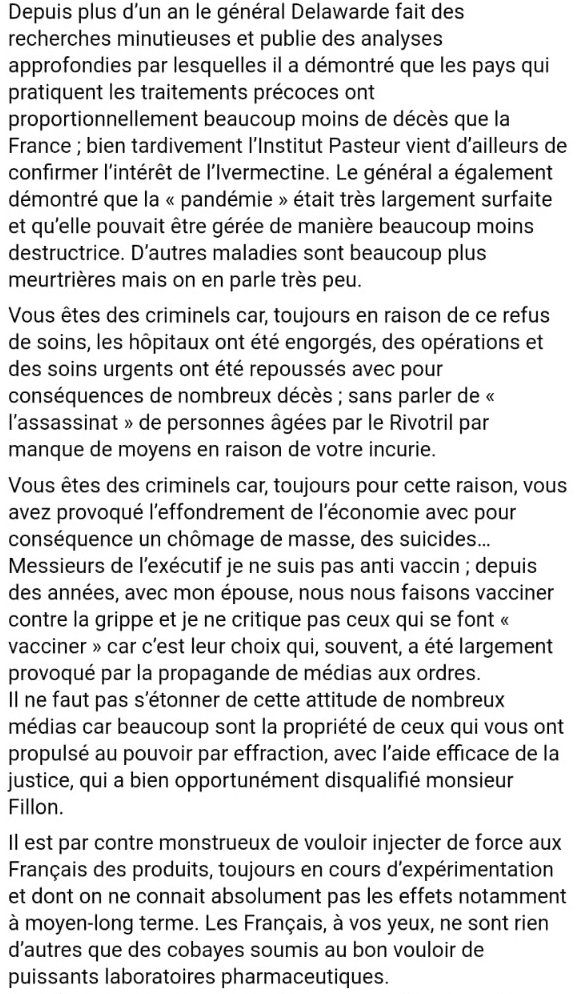 Après les deux premières tribunes de militaires « contestataires » à propos du laissez-aller étatique dans les zones de non-droit, ce texte semble donner maintenant le ton général (sic) de « l’amour » que l’Armée porte à l’encontre de Macron et de sa clique de maffieux mondialistes.