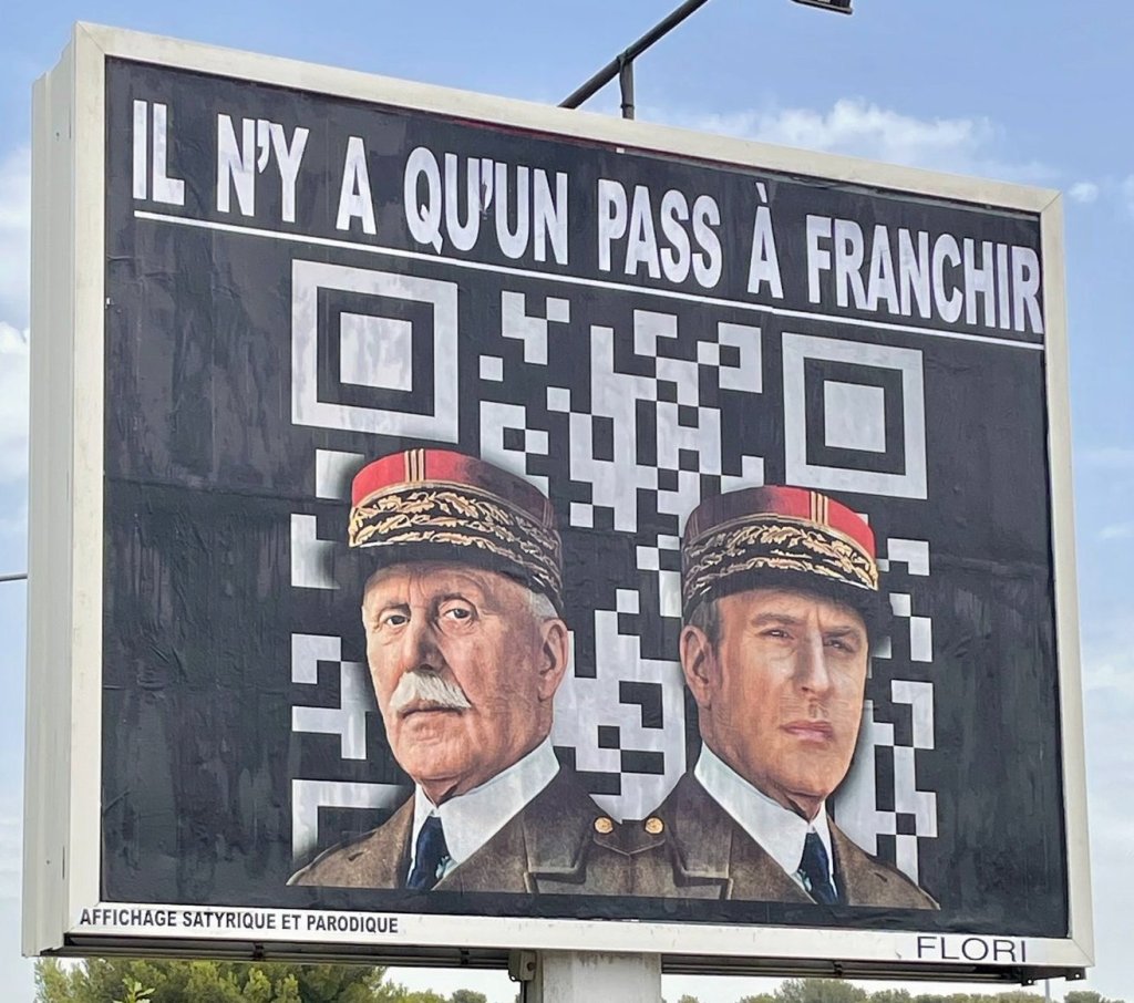 On peut noter l’ « affichage satyrique » (sic) *, le satyre étant probablement le dingue drogué de La République En Marche arrière toute !