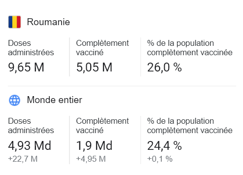 Comme quoi ne pas « vacciner » a du bon. Notons — au niveau des statistiques officielles — que la Roumanie se situe un peu au-dessus de la moyenne mondiale des dits « vaccinés contre la covid-19 », tous procédés confondus.