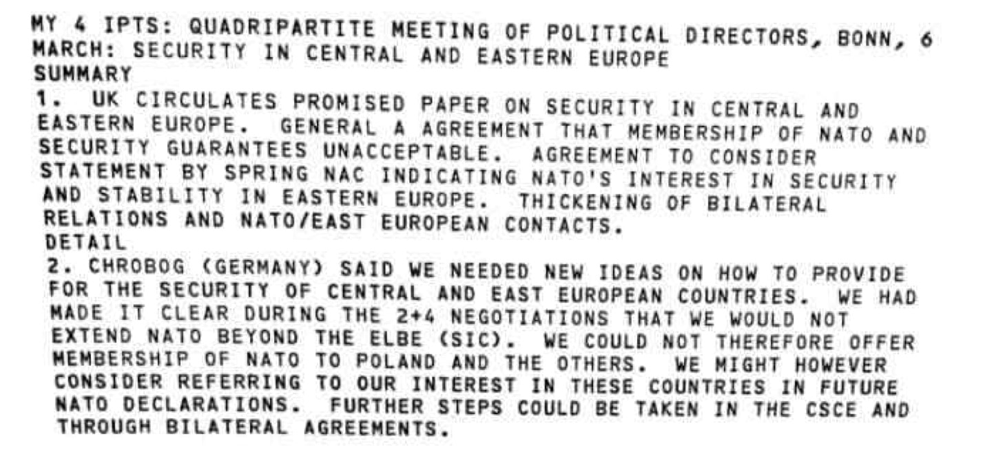 Il ressort clairement du document que le Royaume-Uni, les États-Unis, l’Allemagne et la France ont convenu que l’adhésion des pays d’Europe de l’Est à l’OTAN était « catégoriquement inacceptable » .