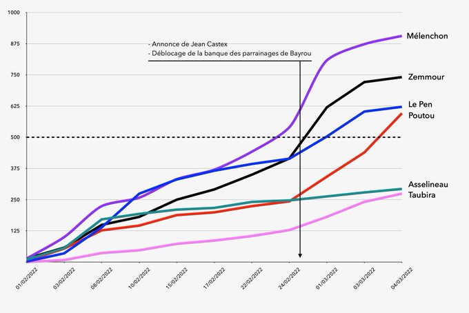 ▪️a soudain catapulté Mélenchon, Zemmour,Le Pen et Poutou largement au-dessus des 500 (même Taubira, très en retard,a été propulsée à 274!)
