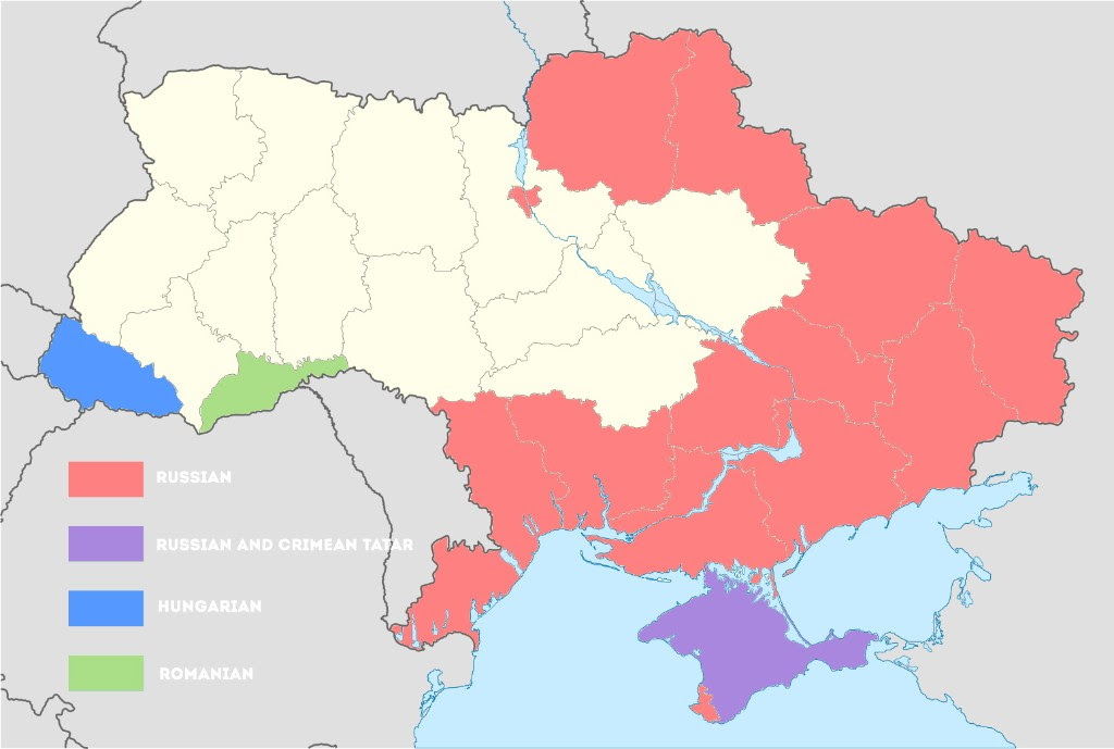 Toute la zone mauve-rose définit le secteur de l’Ukraine où la langue russe est plus ou moins largement parlée ou comprise, en particulier dans les relations bilingues et dans les villes. Tant par des personnes qui se disent ukrainiennes que par des personnes qui se disent russes.