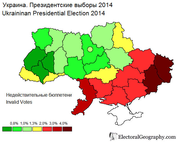 Votes non-validés inférieurs à 2 % : tout le Nord-Ouest et Centre-Nord. Dont inférieur à 0,8 % : tout à l’Ouest en Galicie ; oblasti de Lviv, Ternopil et Ivano-Frankivsk. Le foyer principal des néo-bandéristes.