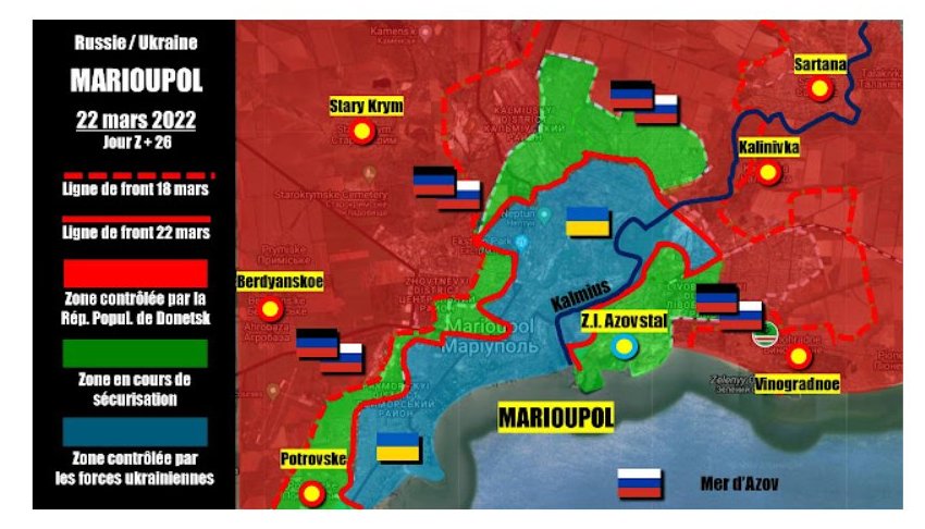 Après avoir pris pied au Nord-Ouest et Sud-Est de Marioupol (1ère ville portuaire du Donbass, cité industrielle majeure, 2ème plus grande ville de la République populaire de Donetsk), les forces républicaines, appuyées par les forces russes ont progressé en isolant progressivement les quartiers par le contrôle des boulevards principaux. Voilà pourquoi sur la carte sont visibles trois zones marquant les avancées des forces russo-républicaines les zones conquises et sécurisées (en rouge) les zones conquises mais où subsistent encore des tireurs isolés et des fuyards ukrainiens (en vert) et les zones encore contrôlées par les forces ukrainiennes (en bleu) et où se concentrent aujourd’hui les combats et bombardements.