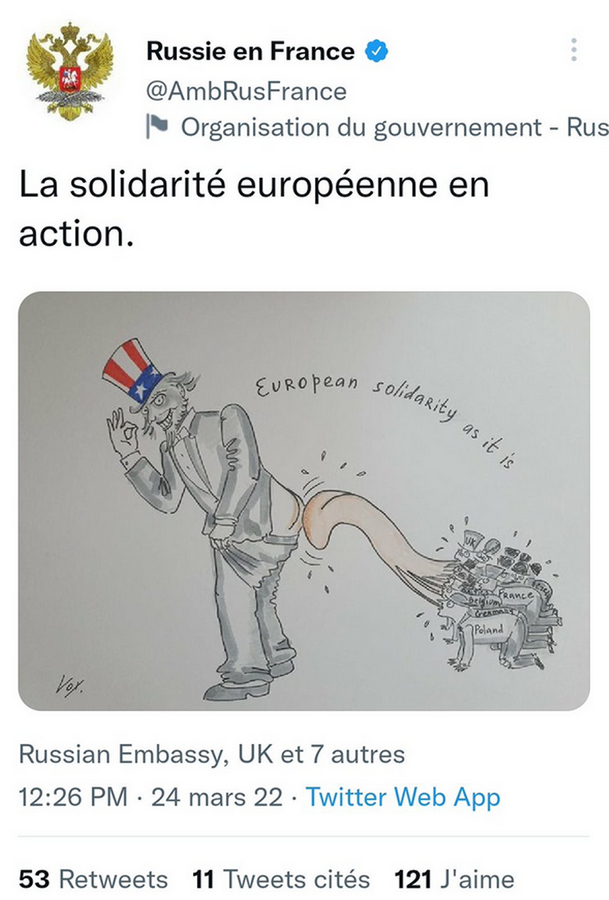 Ces deux caricatures tweetées hier par le compte officiel de l’ambassade de Russie en France (puis supprimées) sont jugées « inacceptables » par le ministère des Affaires étrangères, qui a convoqué l’ambassadeur. (#AFP)