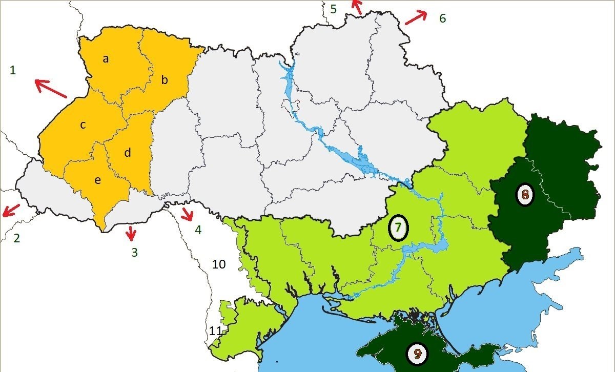 Sans trop vouloir entrer dans les détails de la question de l’avenir territorial de l’Ukraine, et en nous basant sur ce qu’on a pu apprendre de ci ou de là, et évoquer dans des articles précédents, il semble indéniable que ce que vise la Fédération russe ne sont pas seulement les deux républiques du Donbass (8) en voie d’être intégrées à leur demande à la Russie et la Crimée déjà de fait intégrée à sa demande, suite au référendum de 2014, à la Russie (9) mais l’ensemble de la Novorossiya ukrainienne (7+8+9), avec tout le reste de la côte ukrainienne, de Marioupol à l’Est à Odessa à l’Ouest, et même au-delà, dans le Boudjak.
