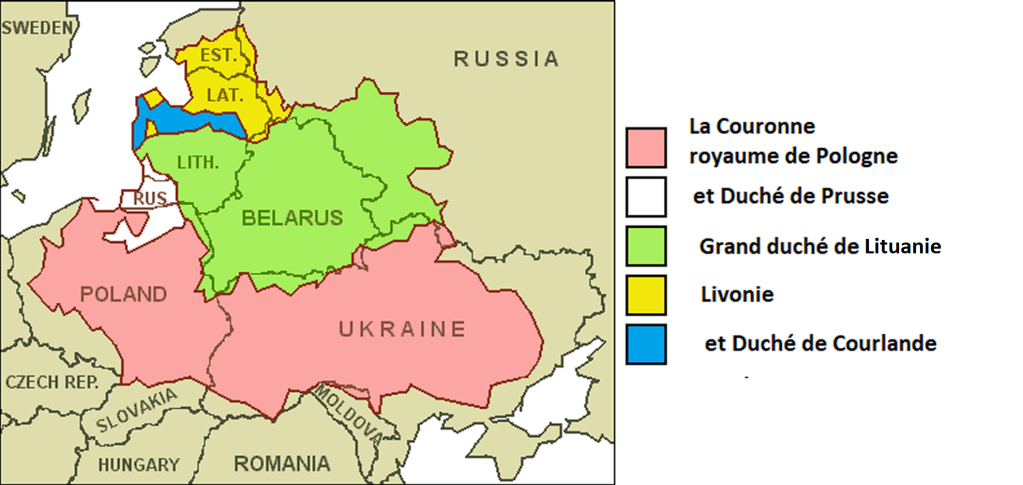 Les contours du royaume polono-lituanien avec ses vassaux en 1619 superposé aux frontières actuelles 1 – La Couronne (Royaume de Pologne) 2 – Borussie ou Duché de Prusse 3 – Grand-Duché de Lituanie 4 – Livonie 5 – Duché de Courlande