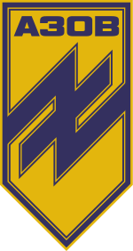 Ceci n’est pas une marque d’automobile, la A 30 B. Mais l’écusson du Bataillon Azov (prononcé : azof). АЗОВ en écriture cyrillique = AZOV. On y retrouve les deux couleurs de l’Ukraine, bleu et jaune, mais en beaucoup plus sombre.