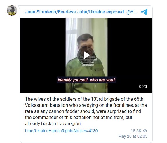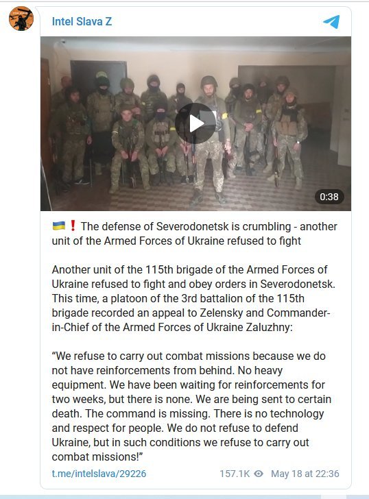 Une autre calamité pour le « Ze Command » a été un message vidéo [[visible sur telegram]] d’une section du 3e bataillon de la 115e brigade de Défense territoriale, dont le commandant a déclaré devant la caméra [[et devant ses hommes regroupés en message qu’il lisait]] qu’il « « n’accomplira pas les tâches de combat assignées à Severodonetsk ». Comme raison, il cite l’indifférence totale de l’état-major, qui envoie sous le « rouleau compresseur » essentiellement des civils qui se sont engagés dans les bataillons volontaires sous l’influence de la télévision zombie.