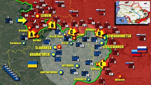 [[État de la guerre dans le Donbass au début de l’offensive finale visant à encercler la part la plus conséquente de l’Armée ukrainienne enterrée et statique depuis le début de l’opération spéciale Z ou V ; positions préparées depuis des mois avec l’aide de l’otan en vue d’écraser les forces donbassiennes et de pacifier et ukrainophoniser de force les populations locales ; action du camp du Bien progressiste bandéro-oligarco-libéral des populations dépassées, contre le camp du Mal crypto-soviéto-nationalisateur des populations attardées, comme l’expliquait il y a quelques jours une « journaliste » venant de Kharkov et vivant maintenant aux États-Unis — d’après Réseau International / 10 mai 2022 / Le front ukrainien craque dans le Nord du Donbass, par Erwan Castel. https://reseauinternational.net/le-front-ukrainien-craque-dans-le-nord-du-donbass/]]