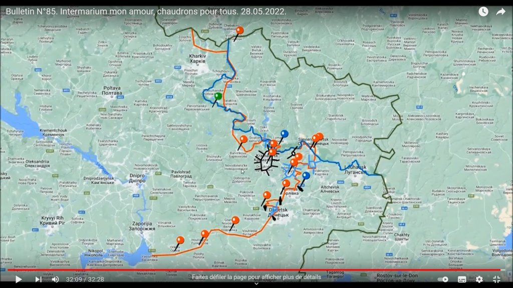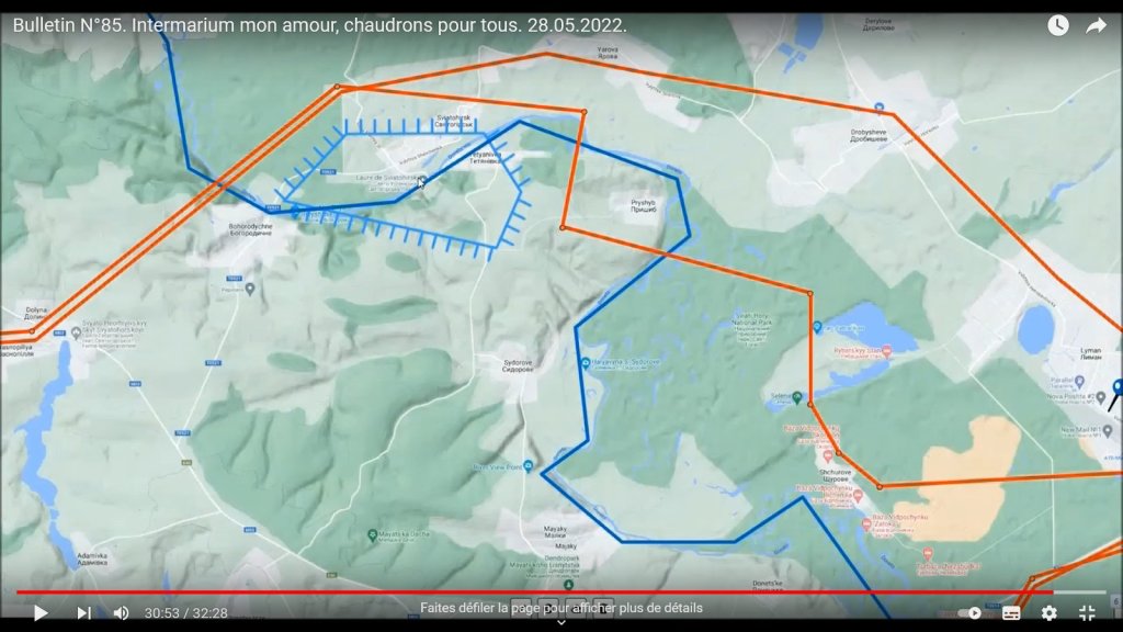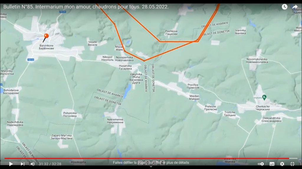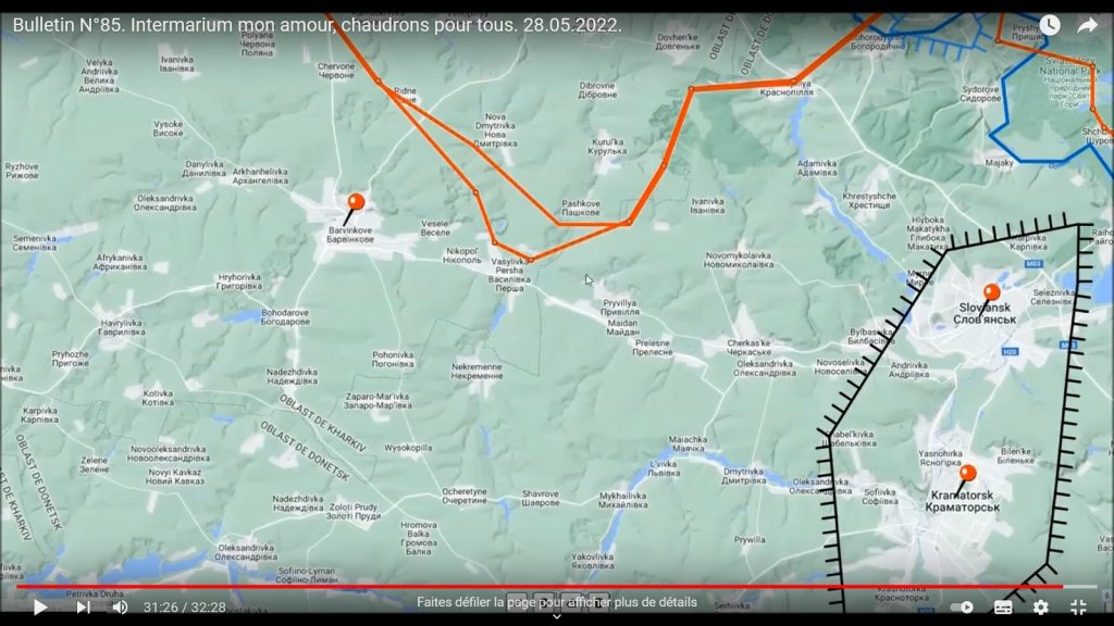(cartes 24, 26 et 27) La progression russe qui entraîne un déplacement vers le sud de la ligne de front du côté de Mayak, Nikopol’, NovoPavlivka, etc. soit de l’autre côté de la limite de l’oblast de Donetsk, sur le territoire de l’Oblast de Kharkiv / Kharkov, vise — comme déjà dit — à couper la ligne Nord-Ouest d’approvisionnement de Sloviansk / Kramatorsk depuis Barvinkove. Avec peut-être comme déjà dit, une volonté d’atteindre cette dernière cité, centre d’extraction de gaz.