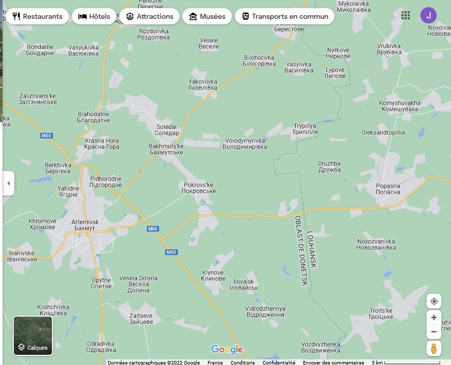 La route de ravitaillement qui va d’Artemovsk-Bakhmout-Soledar vers Lissitchansk est contrôlée au niveau de quelques localités situées au Nord-Est de Bakhmout-Soledar et surtout elle est sous le feu de l’artillerie russe.