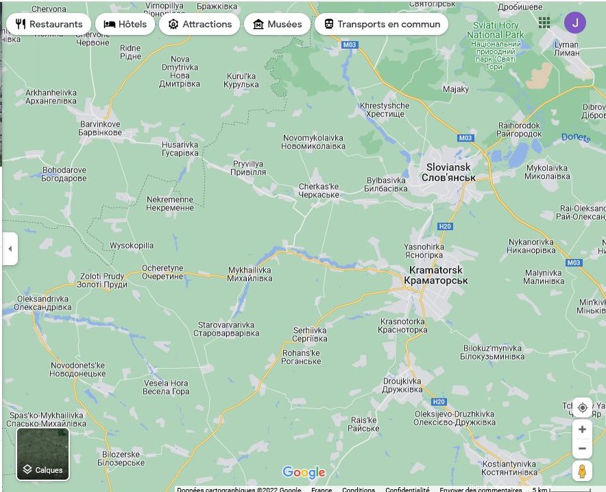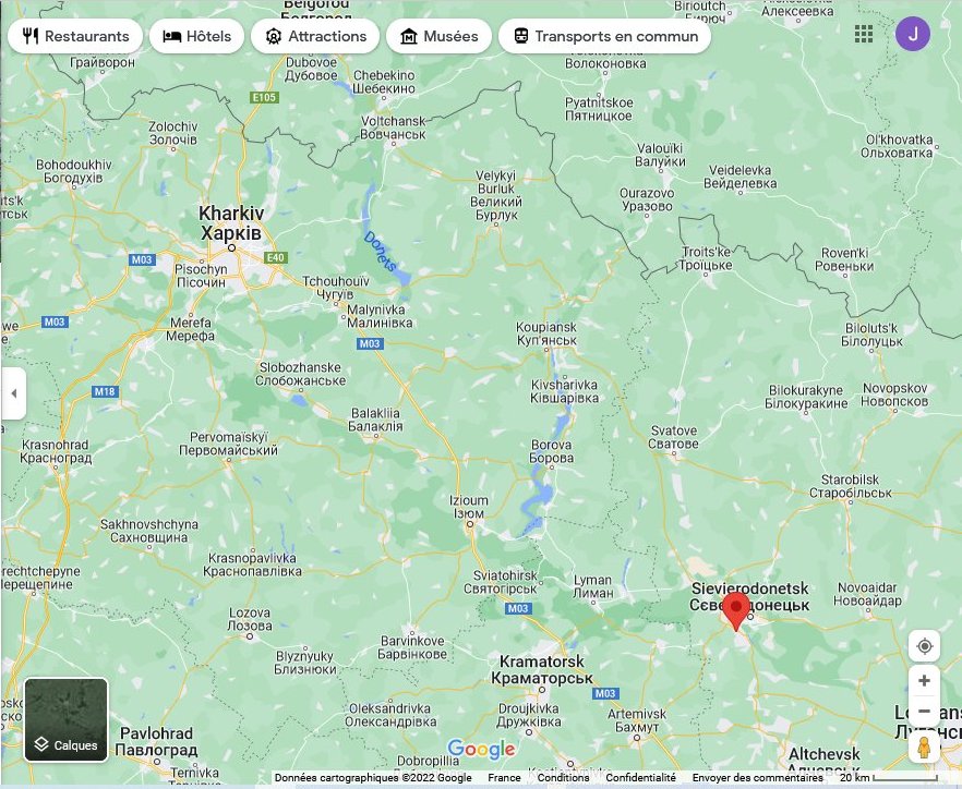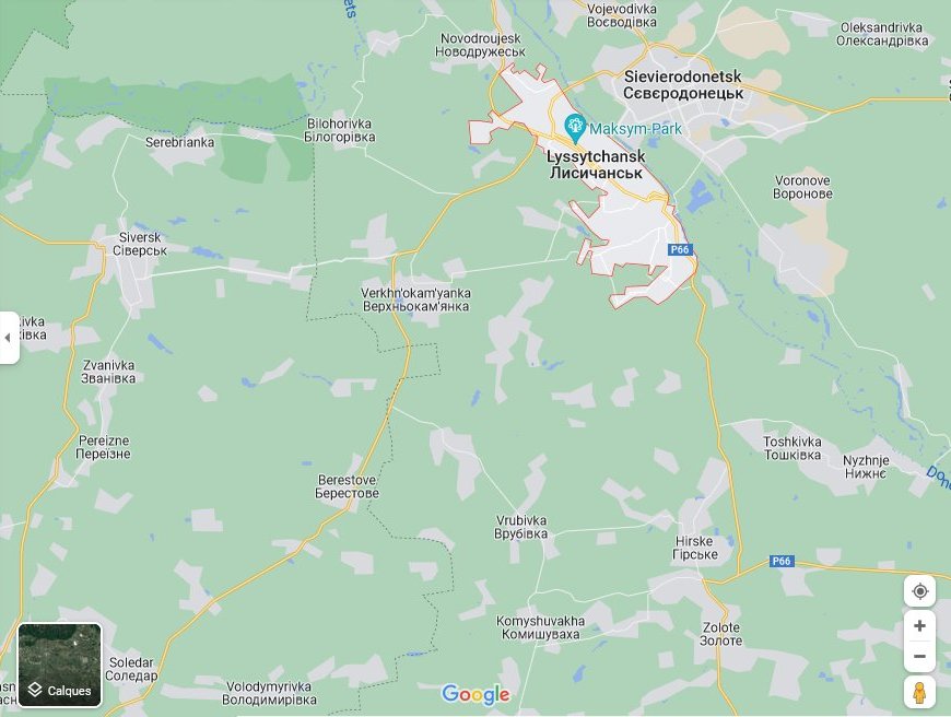 On a appris que des localités plus ou moins proches de Lissitchansk situées au Sud-Est et au Nord-Ouest de la ville ont été conquises par les Russes. Tandis que les autorités de Kyiv reconnaissent la perte de localités autour, ou plus exactement en retrait de Severodonetsk comme Voronovo, Borovskoïe et Sirotino.